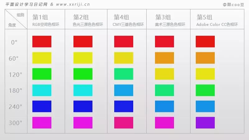从图中,首先第1、2两组色彩,纵向对比下来完全一样。而且第2组色彩与第4组CMY三基色演变而来的色相环,在观感上非常近似,我们几乎可以把1、2、4等同为一组。其色序依次为:红、黄、绿、青、蓝、紫。
