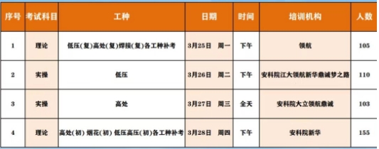 以上就是“2024年3月镇江安全生产考试计划表(第4周)”的相关内容,考生如果想要报考电工证、焊工证、高处作业证,敬请关注西府教育官网或者拨打老师电话:13062923690(同微信)。
